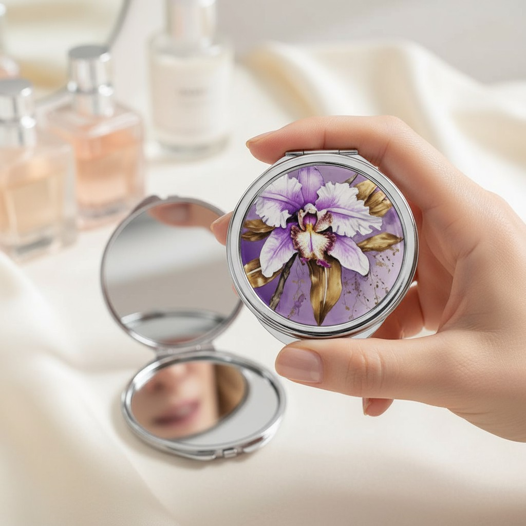¡Lleva contigo un pedazo de Colombia y deja que la belleza de la Cattleya Trianae ilumine tu día con este exquisito espejo de mano!
