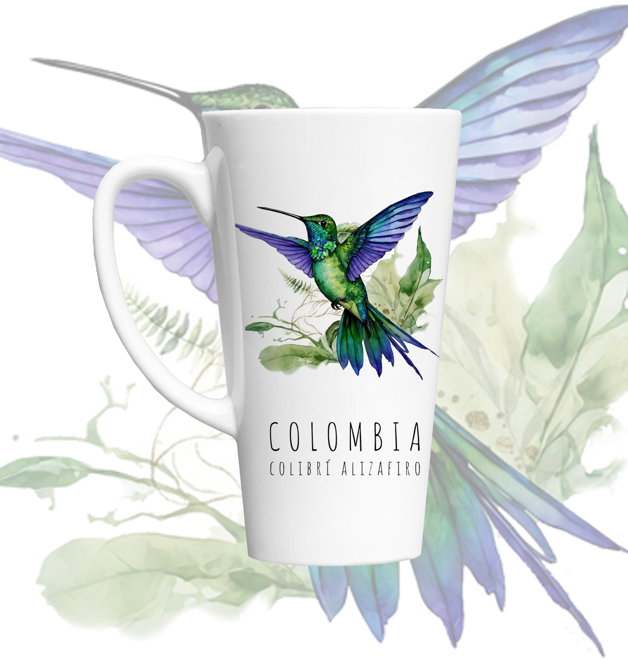 Sumérgete en la belleza y el encanto de la naturaleza con nuestro pocillo alto cónico de cerámica, decorado con una impresionante ilustración en acuarela del colibrí colombiano alizafiro. Este diseño artístico y colorido no solo embellece tu espacio, sino que también inspira el amor y el respeto por los animales.