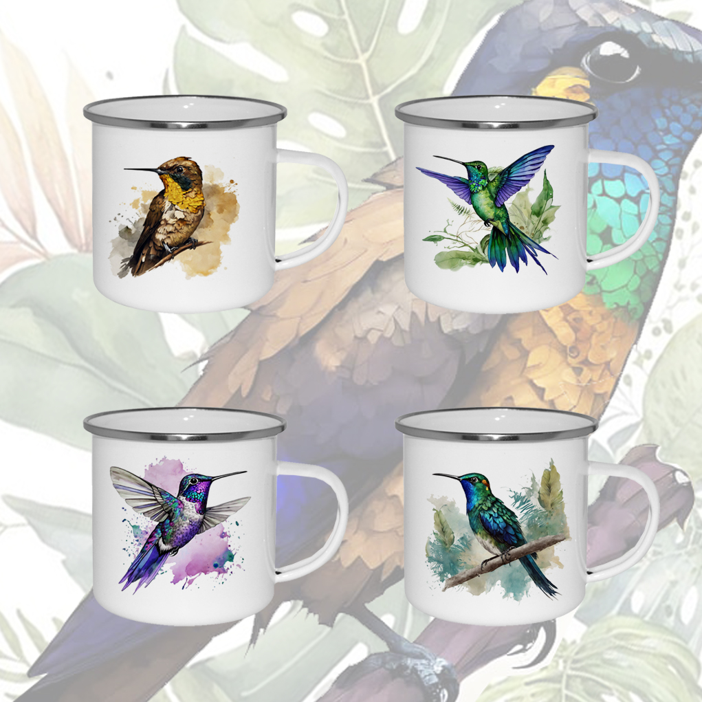 Set de 4 Pocillos de Acero Peltre Blanco con Ilustraciones de Colibríes Colombianos